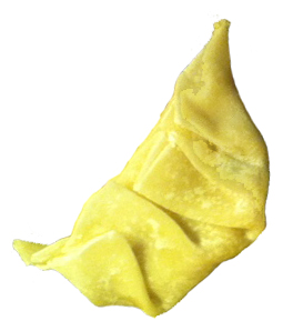 Lägg på ca 1 msk fyllning på varje degplatta. Fukta degkanten med vatten så att sidorna fäster i varandra när du viker ena halvan över den andra och lätt trycker till. Degknytet har nu formen som en halvmåne. Den som vill kan vecka kanten.
