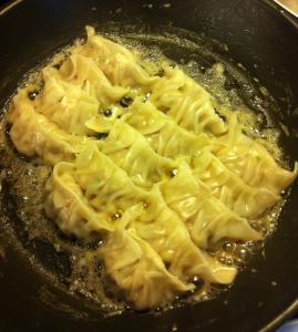 - Häll sesamolja mellan dumplingbitarna och stek ca 5 min, tills de fått färg på undersidan.