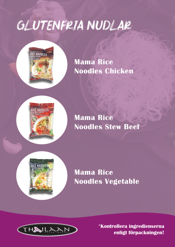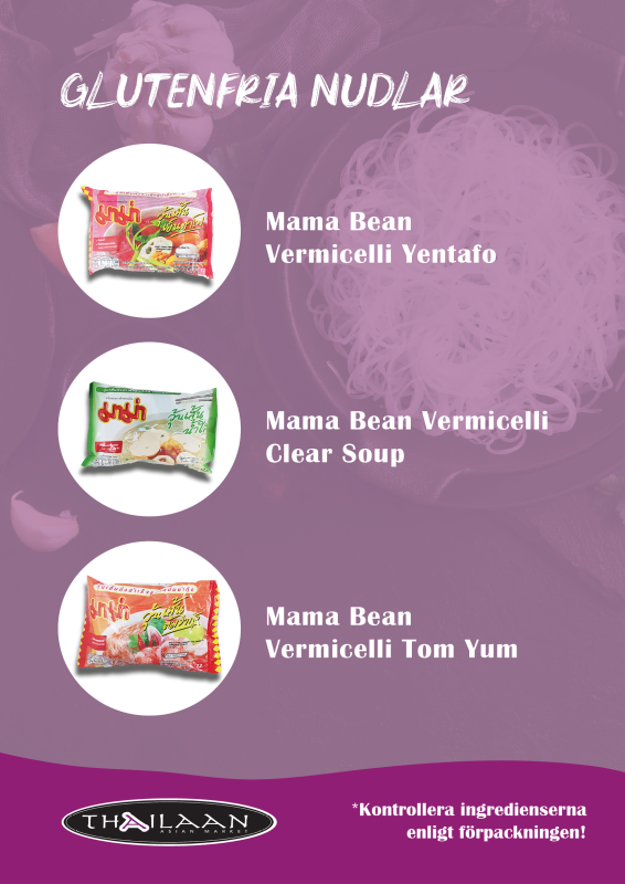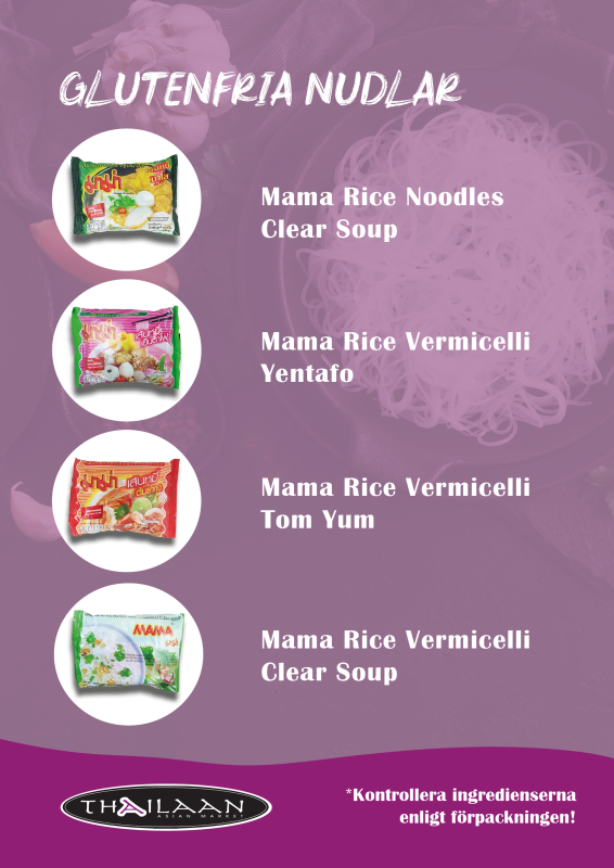 Hos oss på Thailaan hittar du ett brett utbud av glutenfria snabbnudlar med klassiska thailändska smaker som Tom Yum, Yentafo och Clear Soup. Produkterna i listan nedan är utvalda för att vara glutenfria i sin helhet, inte bara nudlarna, utan även övriga ingredienser. Andra varianter har sorterats bort eftersom de innehåller ingredienser med gluten.