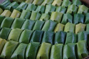 Platta ut risblandningen på bananblad. Lägg mosad thaibanan eller lätt mogen banan på riset och rulla ihop det. Vik bananbladet runt omkring som ett paket och fäst med en trästicka.
