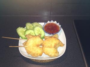 Gott att sätta på spett och grilla är också djupfryst thaikorv som serveras med birdchili, koriander och färsk eller inlagd ingefära samt vitkål skuren i bitar.