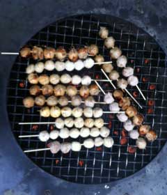 Grilla färdiglagade thaiköttbullar av fläsk- eller nötkött som finns djupfrysta, bara att trä på spett och grilla.