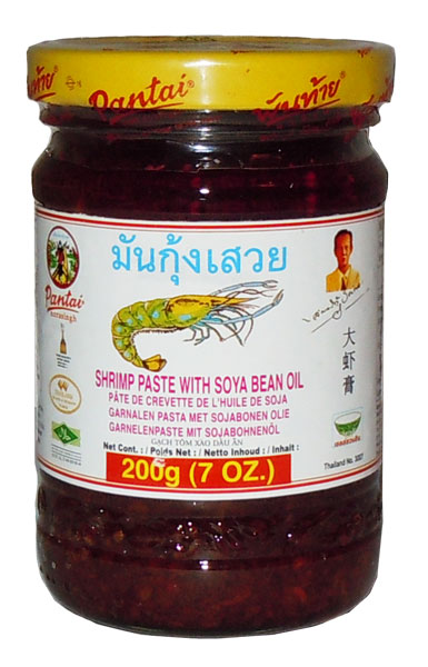 Ingredienser: räkkött 60%, sojabönsolja 28%, vitlök, salt, peppar, smakförstärkare E621, E631 och E627, färgämne E160c
